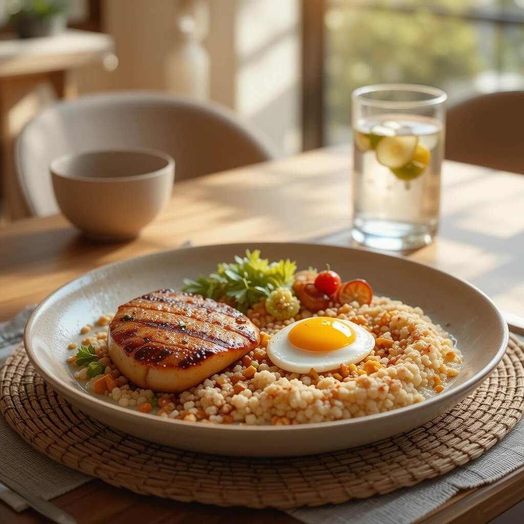 | 단백질(닭고기, 계란)과 복합 탄수화물(귀리, 퀴노아)을 포함한 균형 잡힌 식사가 좋습니다. 또한, 오메가-3(연어, 호두) 섭취는 집중력을 높이고 스트레스 완화에 도움을 줄 수 있습니다. |