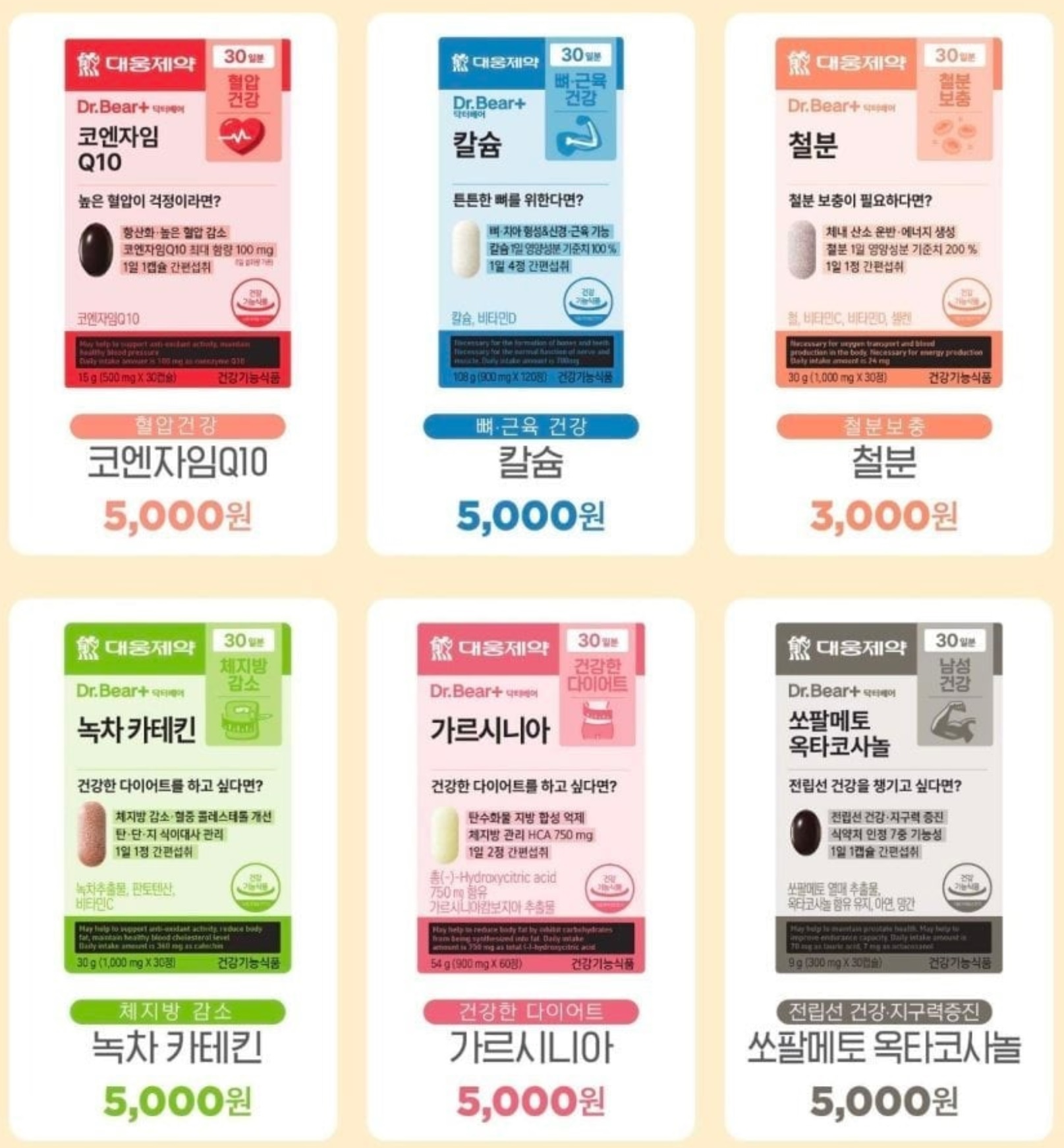 | 다이소 건강기능식품(영양제) | 다이소는 대웅제약, 종근당건강, 일양약품 등의 제품을 판매하며, 가격은 3,000~5,000원으로 책정되었습니다. |