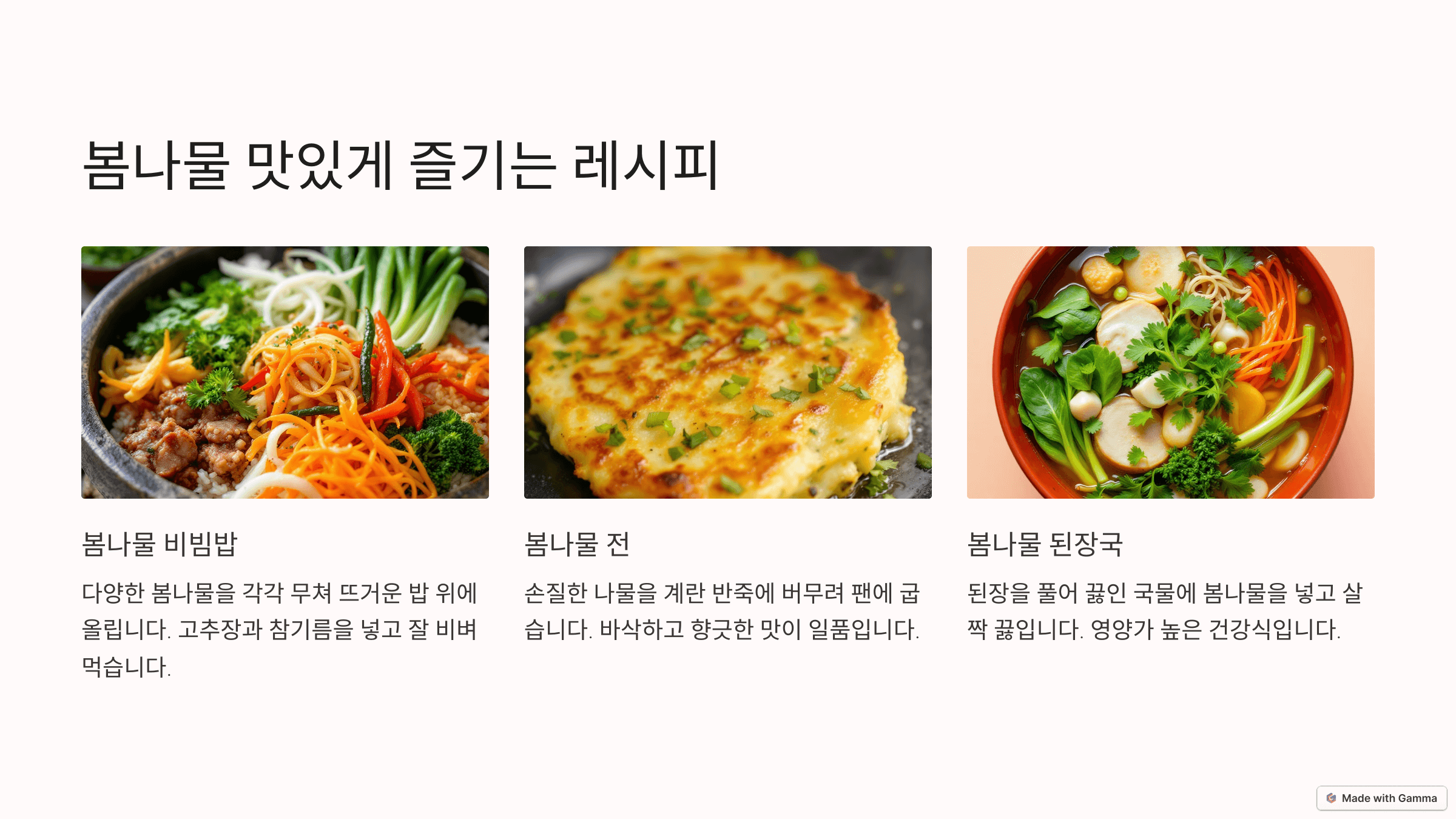 봄나물은 다양한 요리로 활용할 수 있습니다. 나물무침, 전, 국 등으로 만들어 보세요. 아래는 인기 있는 봄나물 요리법입니다.
